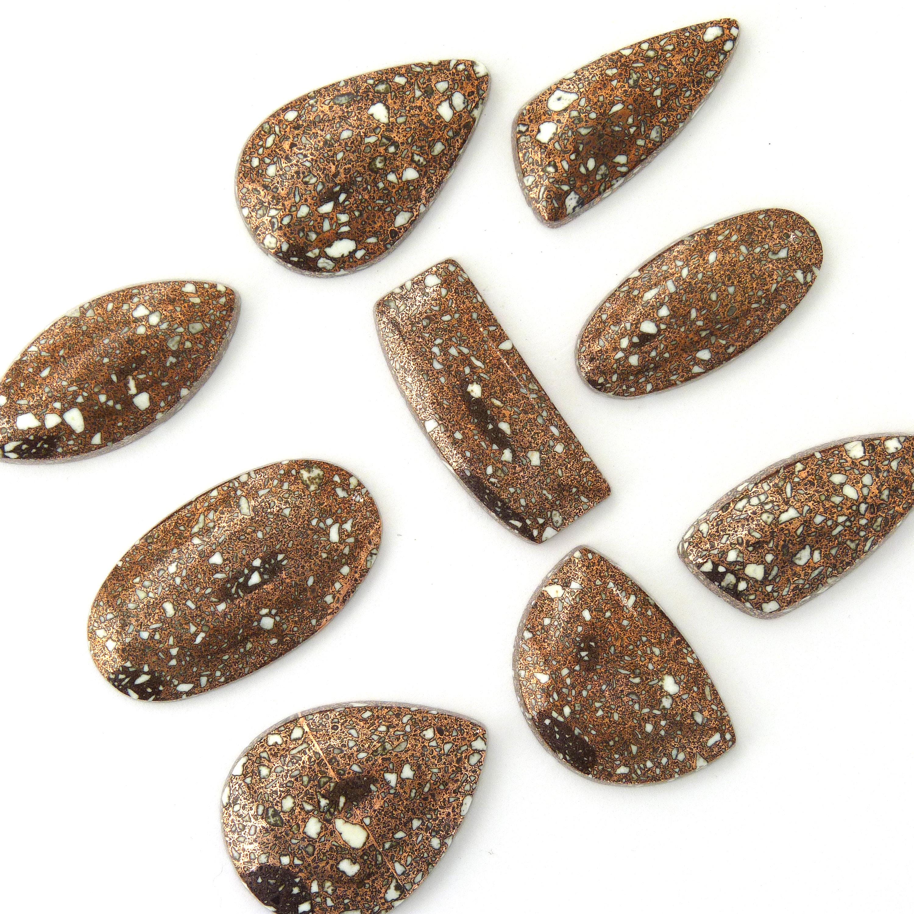 Copper Firebrick cabochons are unique and eye-catching gemstones that captivate with their rich, metallic luster. These cabochons are crafted from an intriguing material known as copper firebrick, formed from the remnants of old copper smelting sites. During the smelting process, molten copper would adhere to the brick walls of the furnaces, creating layers of vibrant metal that blend with the brick’s earthy tones. This fusion results in a captivating mosaic of coppery hues, from deep reds and oranges to shimmering metallic browns, often accented with natural patterns and textures. The cabochons are meticulously cut and polished to highlight these stunning color variations and the interplay of light across their surfaces. Due to their unique origin, each copper firebrick cabochon is one-of-a-kind, offering a distinct piece of history and artistry. They are perfect for creating distinctive jewelry pieces, such as pendants, rings, or earrings, that exude a rustic yet refined charm. With their industrial history and natural beauty, copper firebrick cabochons are a fascinating choice for collectors and jewelry enthusiasts alike.
